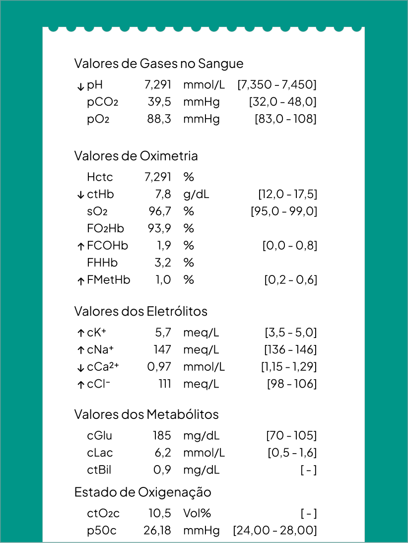 pH 7.291, pCO₂ 39.5, HCO₃ 18.7, BE -7.5... dezenas de valores que você precisa interpretar rapidamente.